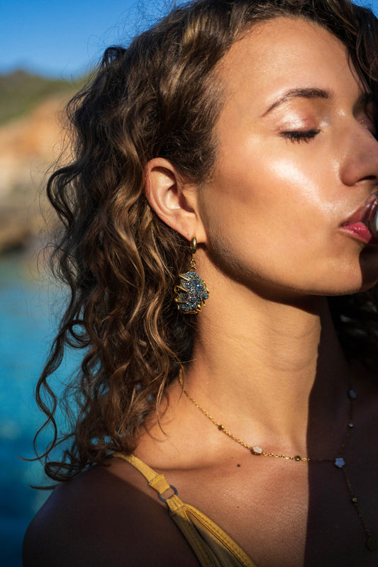 Statement oorringen goud met druzy agaat blauw meerkleurig – MAE.FAE The Label