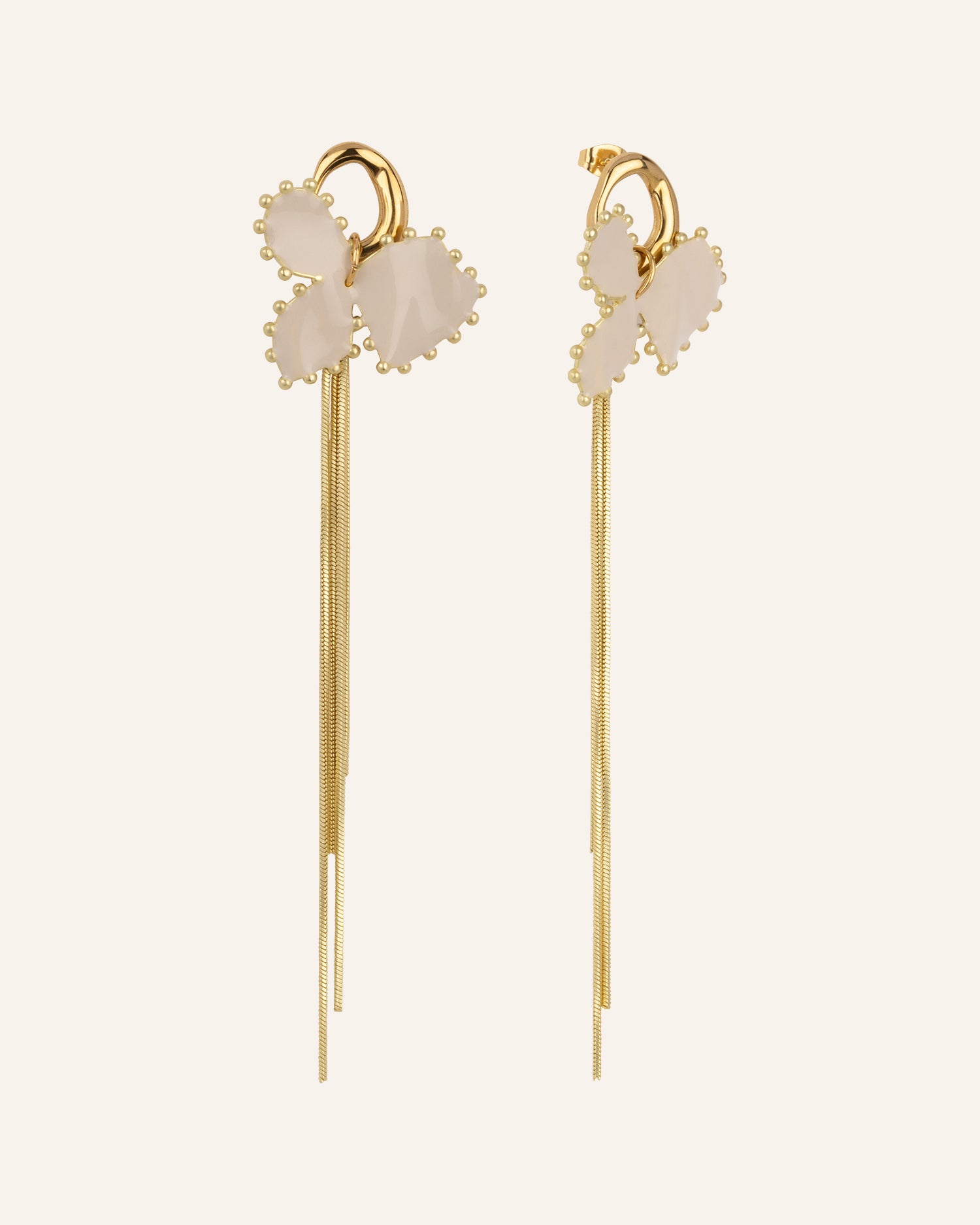 De Estelle oorbellen combineren zachte elegantie met speelse beweging. De bloemvormige details in combinatie met lange gouden fringes zorgen voor een sierlijk effect dat perfect is voor een feestelijke gelegenheid of een chique diner.