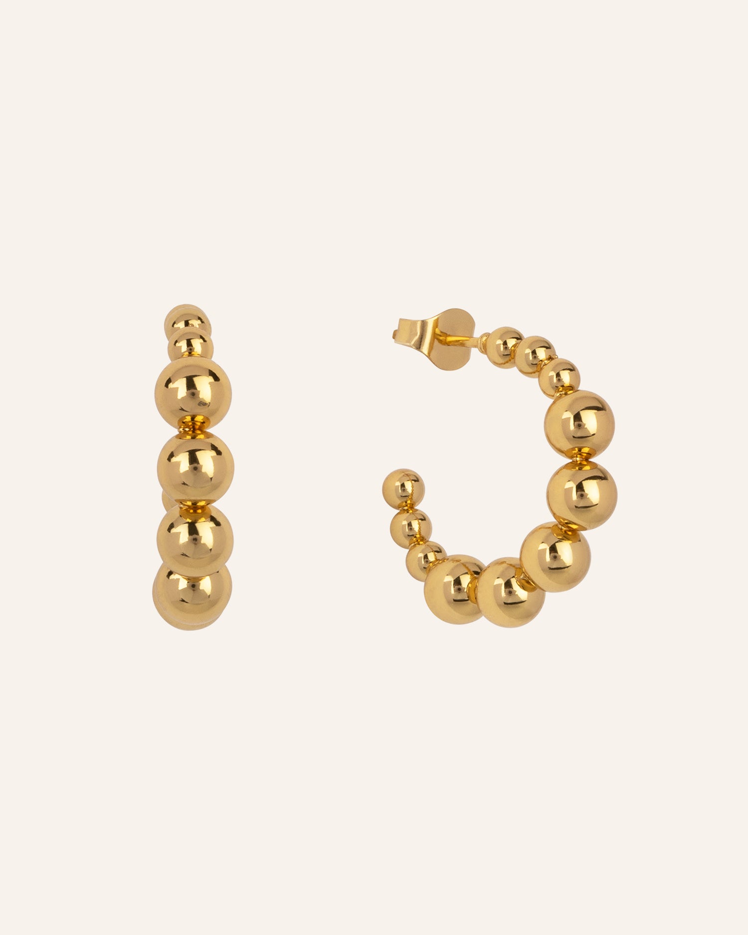 De Jaimy oorbellen zijn speelse hoops met een moderne twist. Het design van glanzende gouden bolletjes geeft ze een tijdloze, maar toch edgy uitstraling. Perfect te combineren met zowel een minimalistische look als een opvallende ear stack.