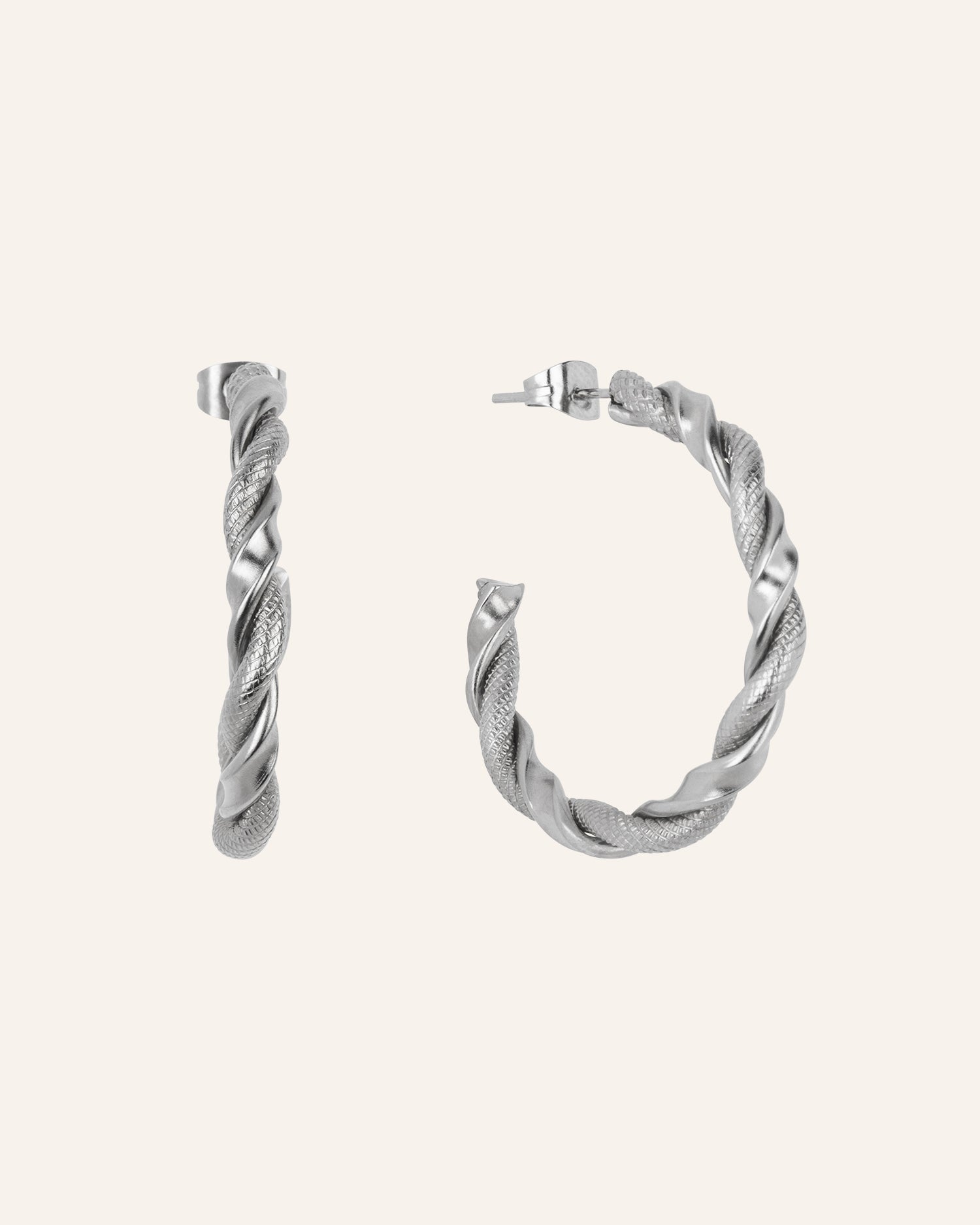 Stoer en elegant tegelijk, de Joëlle oorbellen vallen op door hun verfijnde, gevlochten structuur. Het gedraaide ontwerp in zilverkleur creëert een krachtige uitstraling die iedere look naar een hoger niveau tilt. Ideaal voor wie houdt van een statement met klasse.