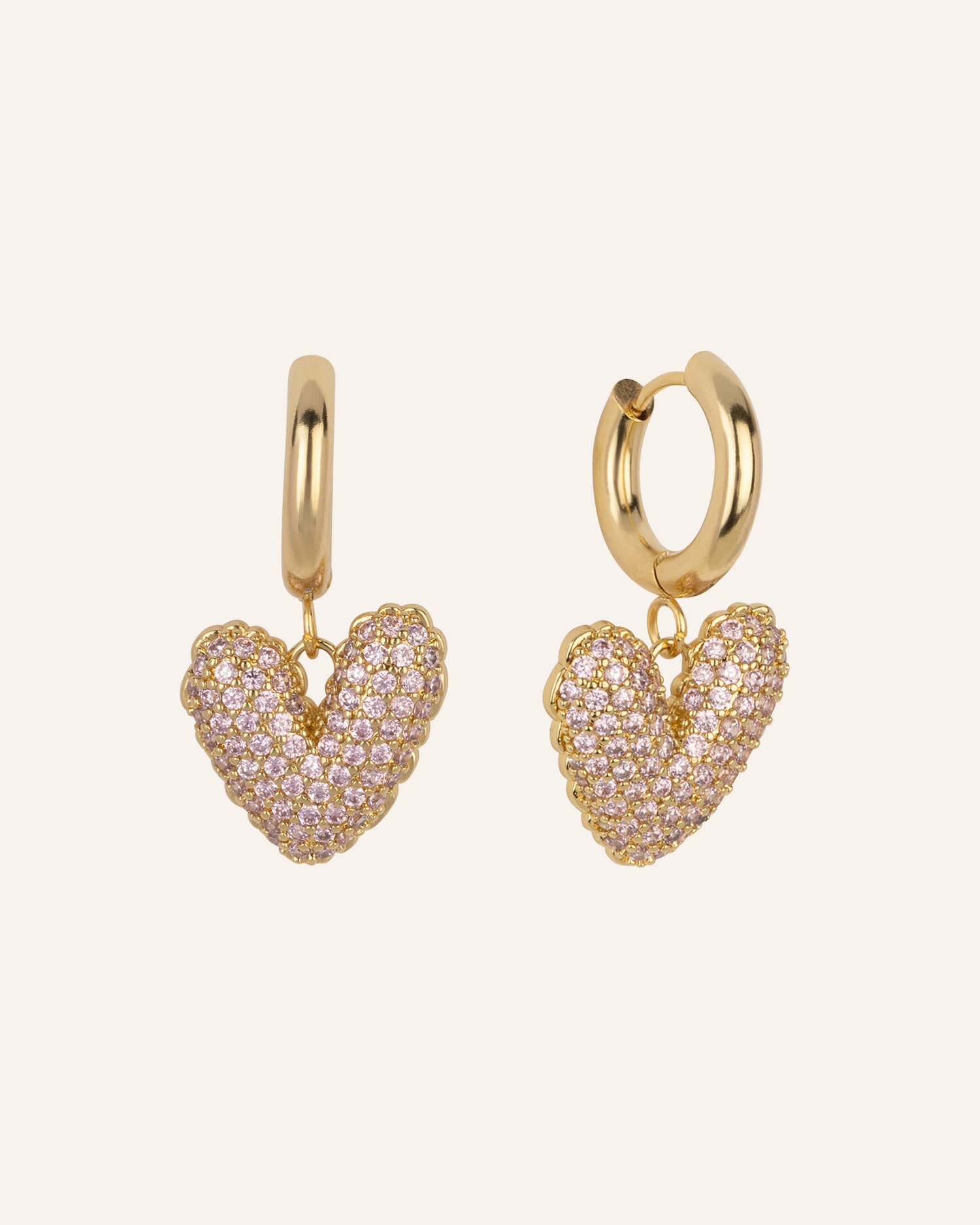 De Stella oorbellen zijn pure liefde in een sieraad. De gouden hoops met hartvormige hangers, volledig bezet met steentjes, stralen romantiek en speelsheid uit. Een schattig paar dat perfect is om je look een zachte, maar opvallende sparkle te geven.