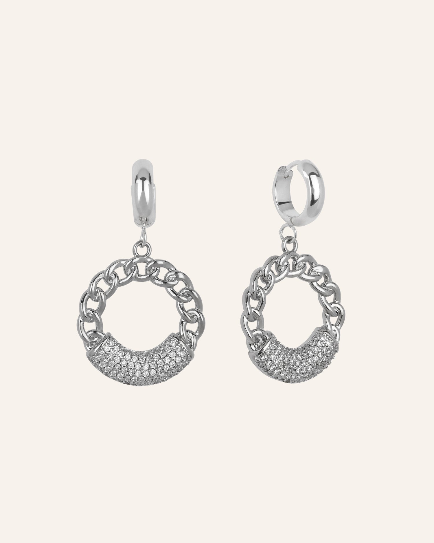 De Yara oorbellen combineren stoer en chique in één design. De zilverkleurige hoops met chunky schakelring en sprankelende details vormen een krachtig statement. Een modern paar dat je outfit meteen een edgy, maar elegante twist geeft.